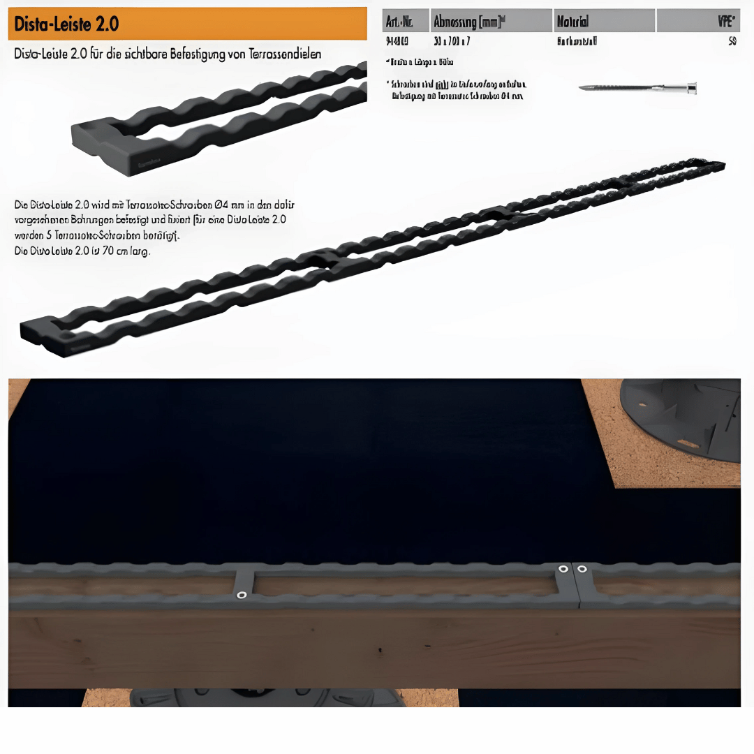 Výrobek vám zaručí přesný spoj a spáru mezi jednotlivými terasovými prkny. Díky tloušťce podložky (6 mm) výrobek podporuje ventilaci mezi konstrukcí a samotnými terasovými prkny. Doporučení spáry podle typu terasových prken: